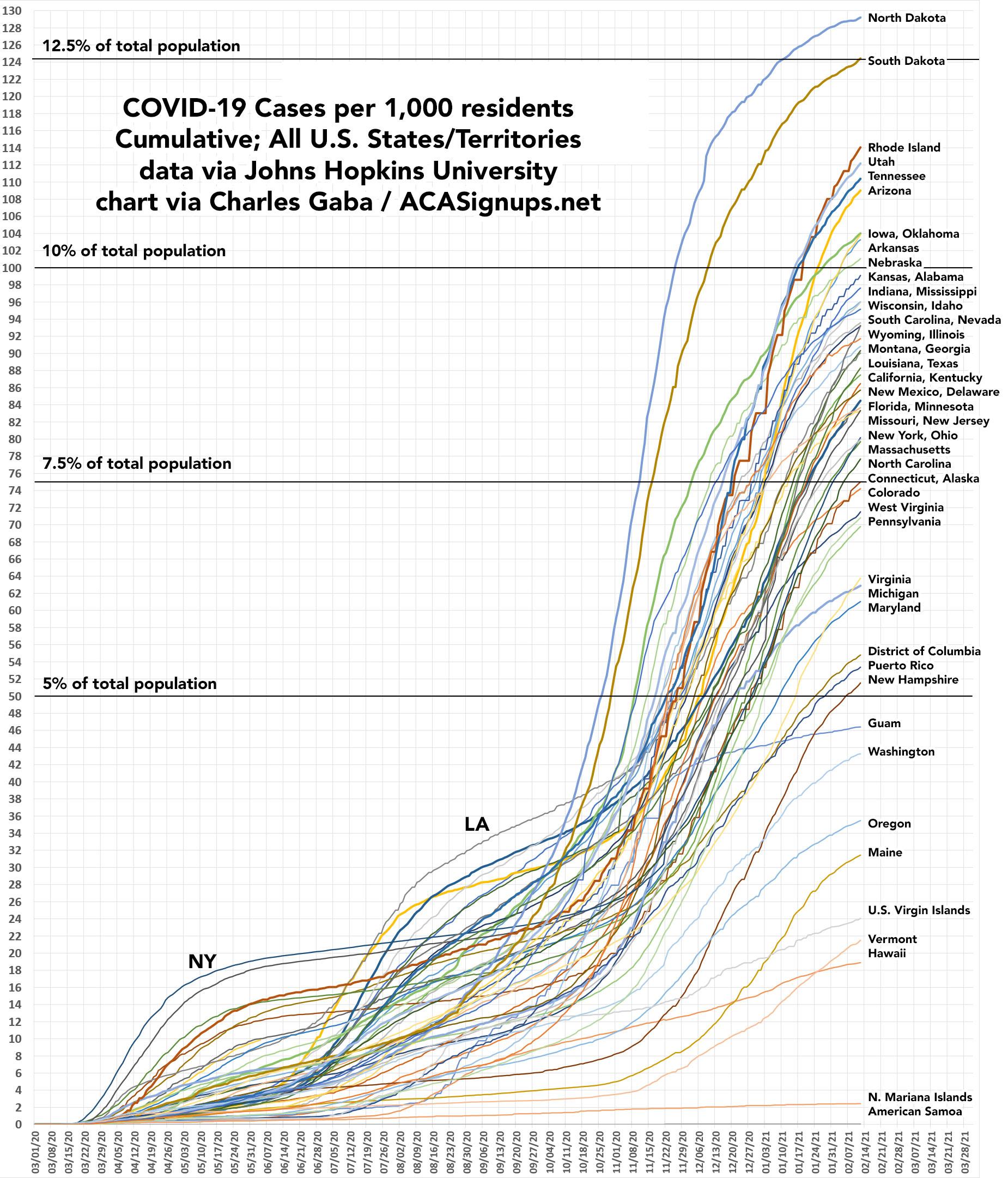 I've done my best to label every state/territory, which obviously isn't easy to do for most of them given how tangled it gets in the middle. For cases per capita, the most obvious point is that New York and New Jersey, which towered over every other state last spring, are now utterly dwarfed by North & South Dakota, although things are getting pretty horrible everywhere now.