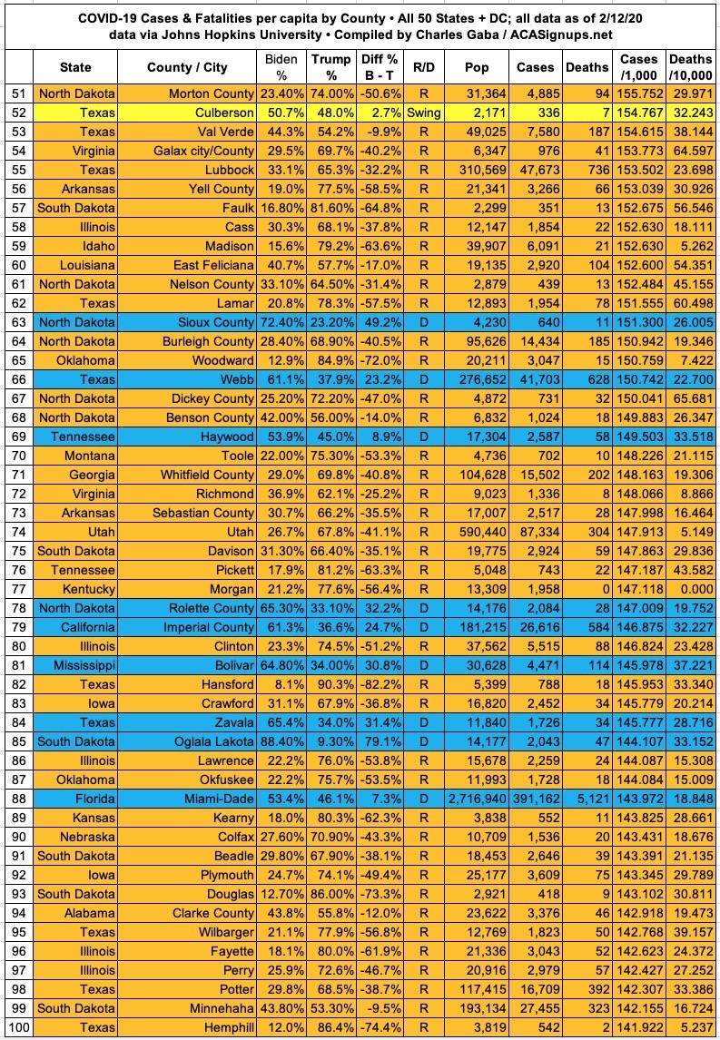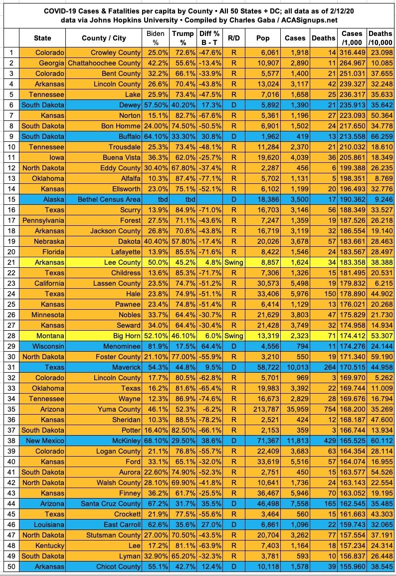 Here's the top 100 counties ranked by per capita COVID-19 fatalities as of Friday, February 12th, 2021 (click image for high-res version):