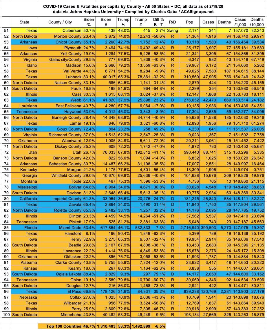Here's the top 100 counties ranked by per capita COVID-19 fatalities as of Friday, February 19th, 2021 (click image for high-res version):