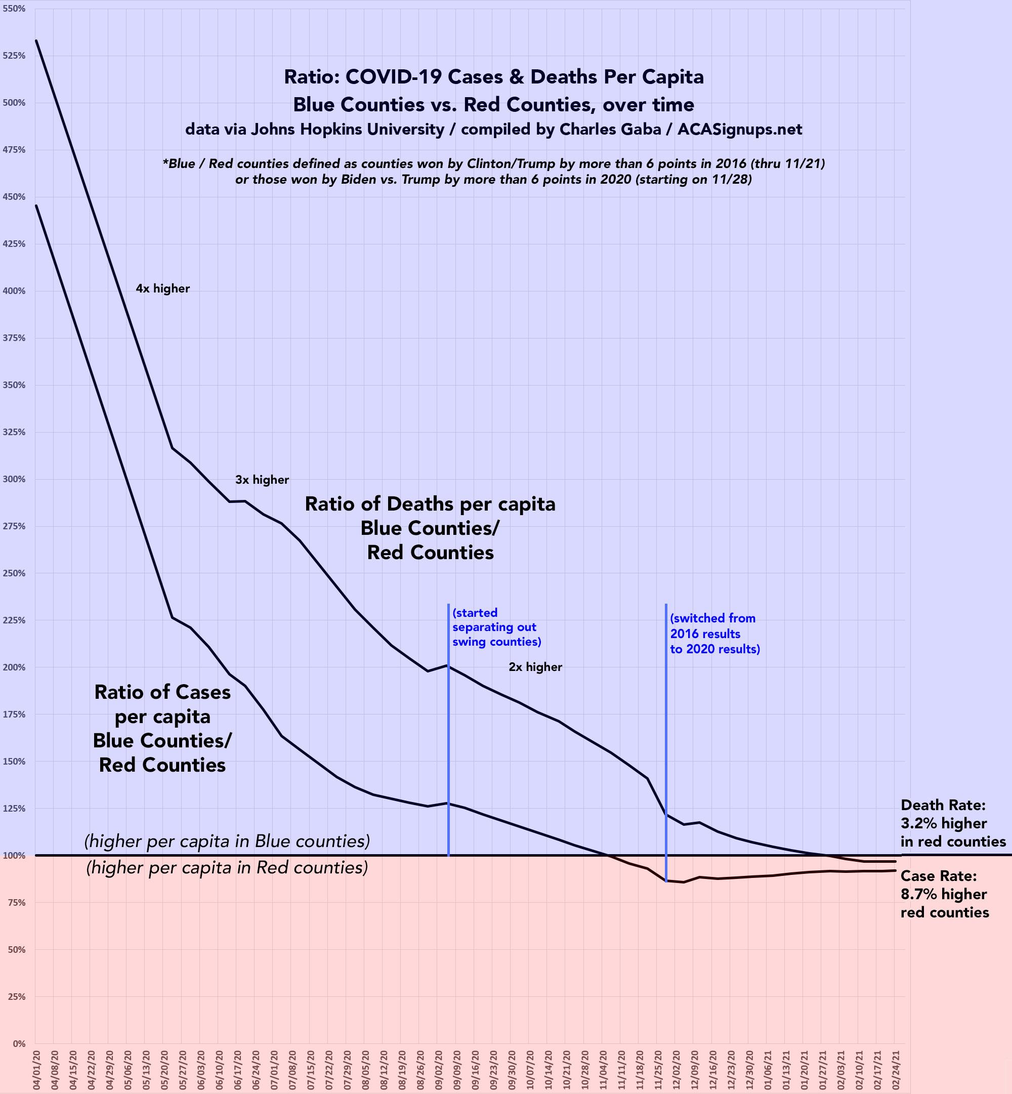 It's also worth noting how the ratio of per capita cases and mortality have shifted between the Blue and Red-leaning counties over time.