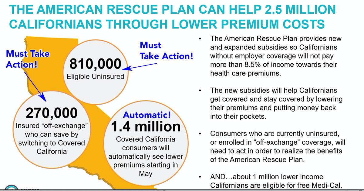 The uninsured: New data shows that an estimated 810,000 Californians are uninsured and eligible for health insurance coverage through Covered California. Under the American Rescue Plan, most of them would be able to get a high-quality plan from a trusted name-brand company for as little as $1 per month, or a plan that offers richer benefits for less than $100 per month.