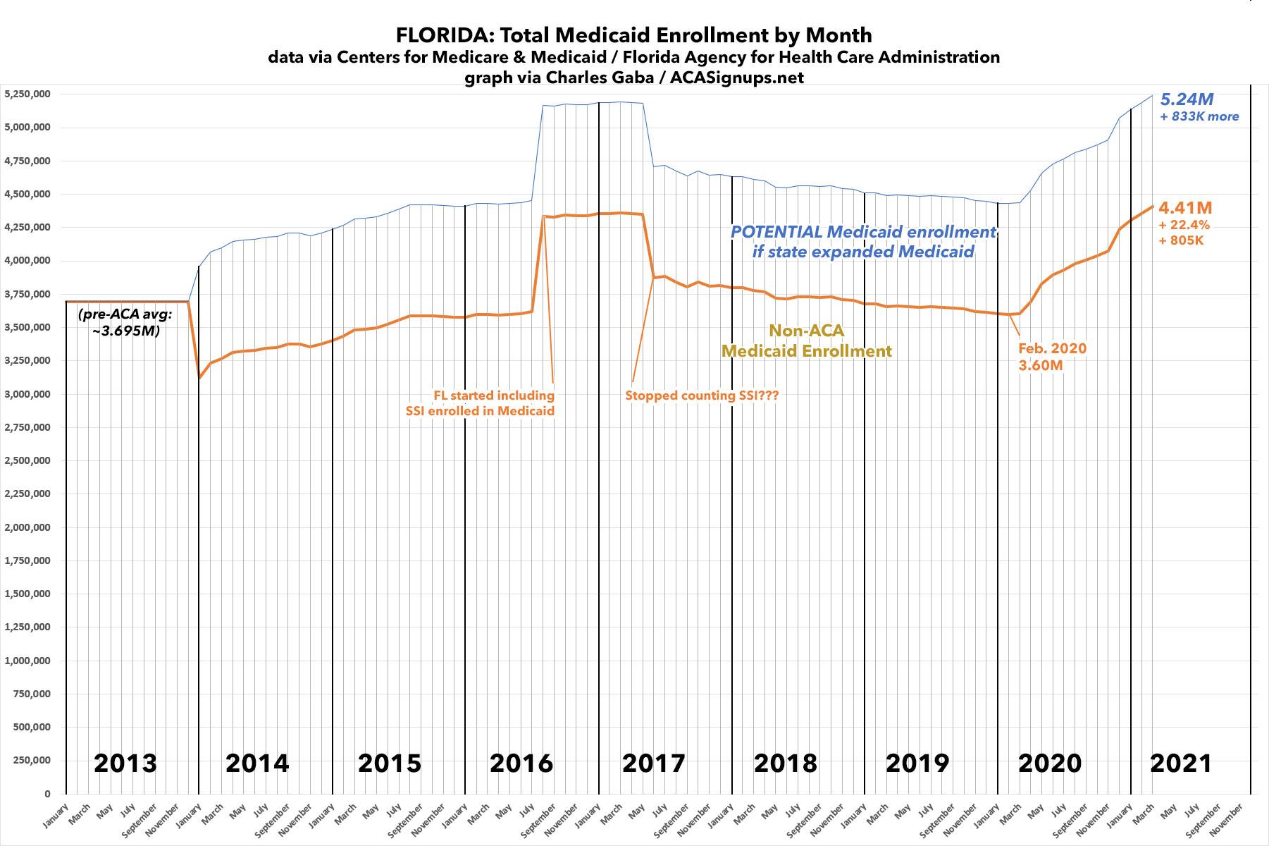 Since then, enrollment even in non-ACA Medicaid has jumped dramatically, reaching a high of over 4.4 million in March 2021 (and it would likely be closer to 5.2 million or higher if ACA expansion was in place). Non-ACA Medicaid was up a dramatic 22.4% vs. pre-COVID levels. Florida has 21.5 million residents, so 4.41 million is 20.5% of the entire population.