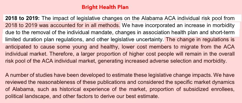 Assuming I'm close, however, unsubsidized Alabama residents should see their 2019 premiums drop by about 2% next year...except that they would be dropping substantially more if not for the mandate penalty being repealed and the expansion of #ShortAssPlans, as clearly noted in the filings for both companies. The Urban Institute assumed a whopping 21.6% sabotage tax, but I'm knocking 1/3 off that to be cautious and assuming "only" 14.4%. If so, that means unsubsidized Alabama enrollees will be paying nearly $1,200 more apiece next year than they should be: