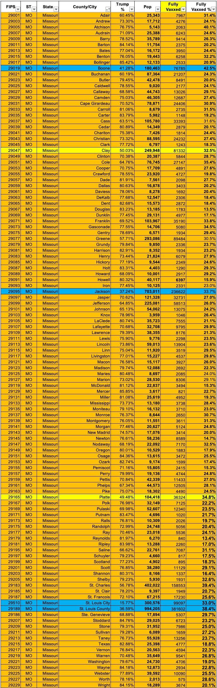 Note: The CDC lists ~207,000 Missouri residents (10.9% of the total fully vaccinated) whose county of residence is unknown.