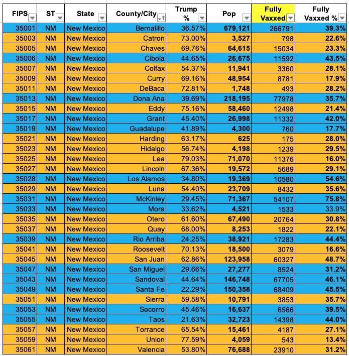 WARNING: The CDC lists ~199,000 New Mexico residents (a whopping 25% of the total fully vaccinated) whose county of residence is unknown. This could easily skew the actual results below one way or the other.