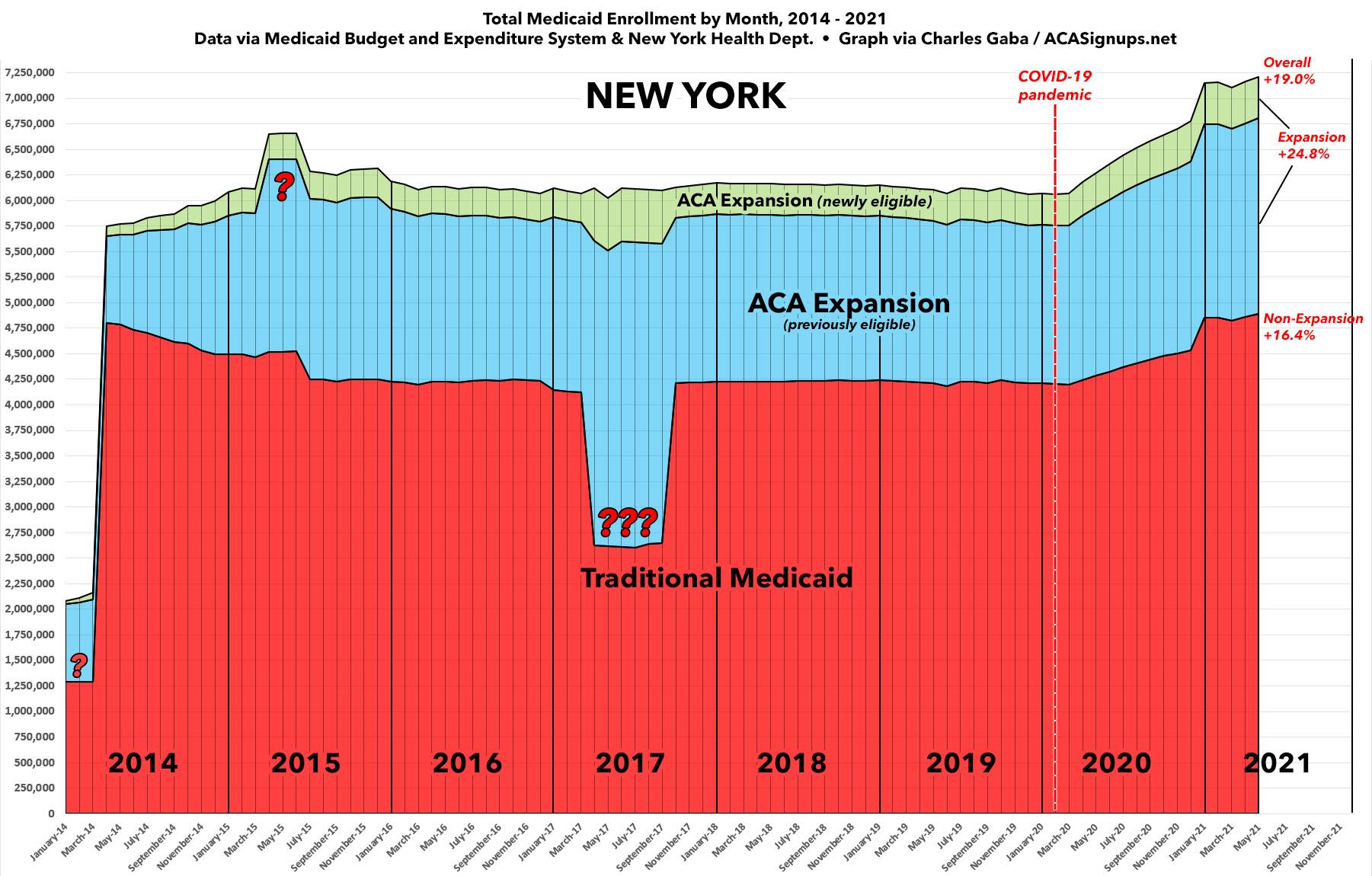 Since COVID hit New York hard in early 2020, however, non-ACA Medicaid enrollment has increased by 16.4% and the expansion population has grown by 24.8%, for an overall increase of 19% in the COVID era.