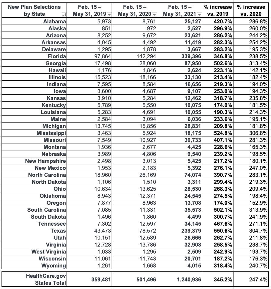 The number of new plan selections from the start of the SEP opportunity on February 15 through May 31 represents a substantial increase in enrollment from the same period in 2020 and 2019, when 501,000 and 359,000 consumers signed up for Marketplace coverage, respectively.[2] In previous years, SEPs were available primarily only for qualifying life events, whereas this year the Biden-Harris Administration opened a SEP to all Americans in response to the COVID-19 Public Health Emergency.