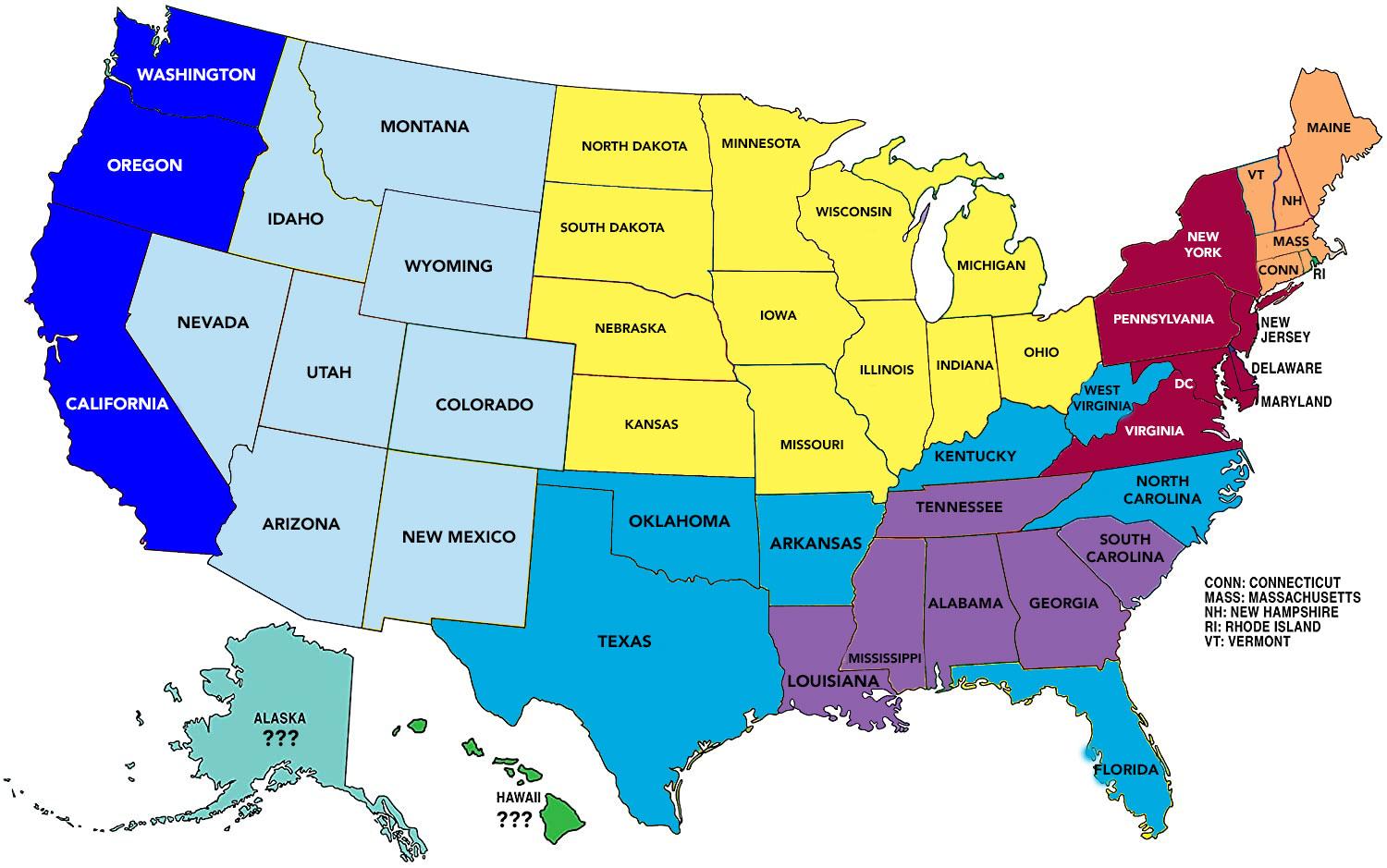 Obviously, your opinion my vary on some of these, but overall I think it's pretty good. Here's a crude map of how I have the country broken out. Note that I didn't know what the heck to do with Alaska and Hawaii, and I seriously debated about whether to split the Dakotas, Nebraska and Kansas out on their own before deciding to keep them lumped in with the rest of the Midwest: