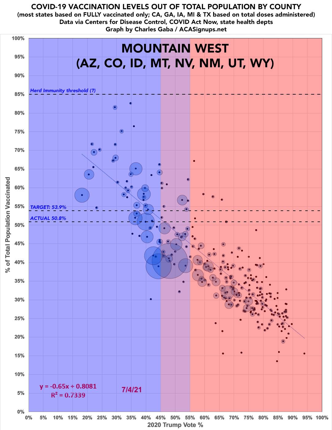 I've already written about the obvious racial inequity factors which seem to be causing even the bluest Deep South counties to lag so far behind in vaccination rates. I don't have any similar insight into what's going on with the Mountain West/West Coast states, however.