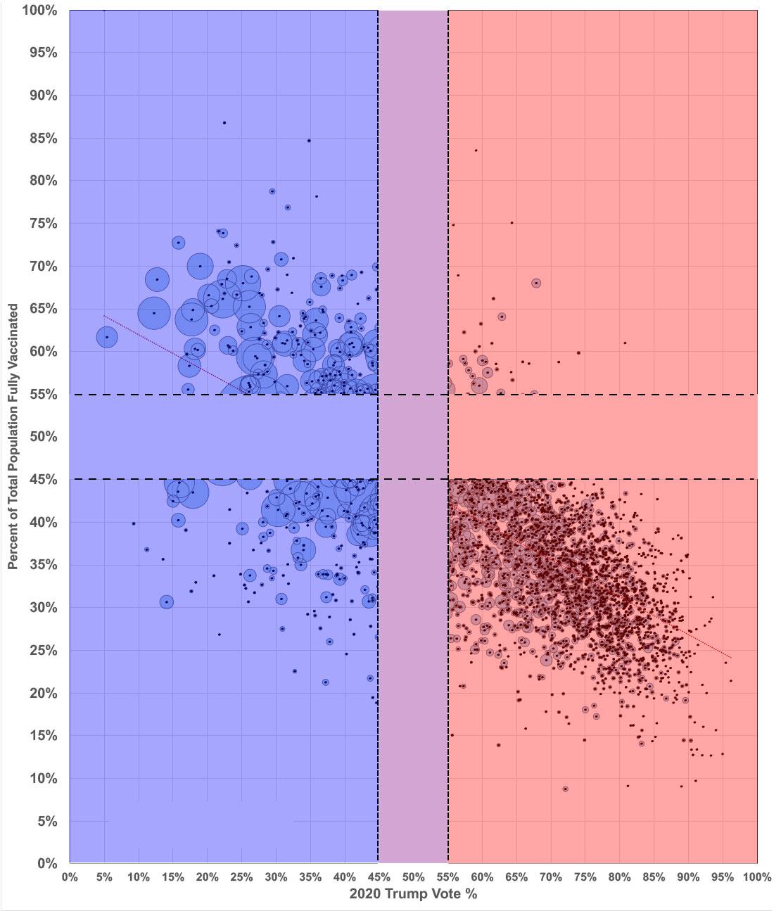 The lower right quadrant (deep red / low-vaxx, or deep MAGA country if you will) has roughly 41 million unvaccinated residents over 11 years old who could get vaccinated, or 2.5x as many as the other two quadrants above combined. The question here is how many of these folks will continue to refuse to #GetVaxxed no matter how many resources are thrown at them. Some are gettable, of course...but far too many don't appear to be.