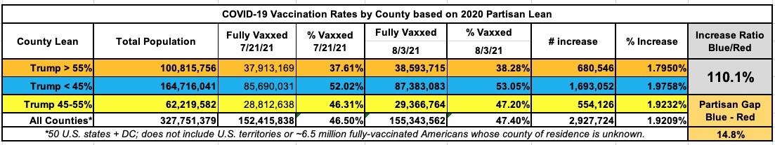 It's also worth noting that the Blue Counties (ones where Donald Trump received less than 45% of the vote last November) have increased their collective vaccination rate by 10% more per capita than the Red Counties (where Trump received more than 55% of the vote) since July 21st. This is the first time that I've compared how the relative rates have changed over time, so I have no idea if this gap represents an increase or decrease from earlier this spring or summer.