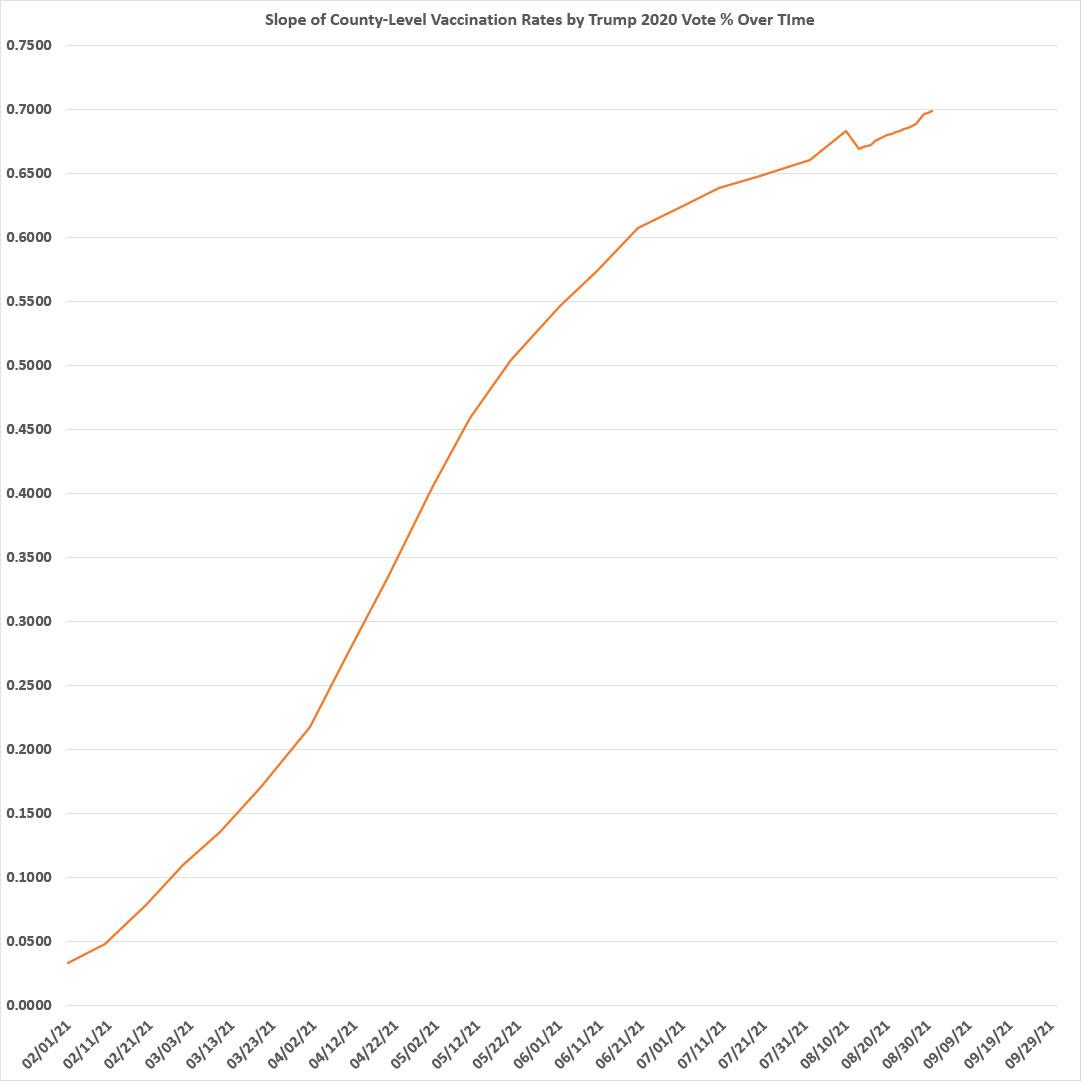 It's also important to note that while there was a very slight, one-time drop in both the R2 (correlation) and slope formulas a two weeks ago when I switched from 2019 estimated population data to official 2020 U.S. Census data for every county, this drop has since reversed itself and continued its gradual climb higher on both the correlation and slope fronts: