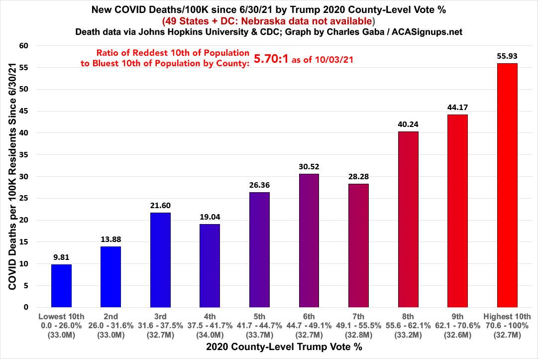 Yowza. The death rate since June 30th in the reddest bracket is now 5.7x higher than the bluest bracket. That's an increase from a week ago, when it was "only" 5.5x higher.