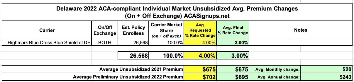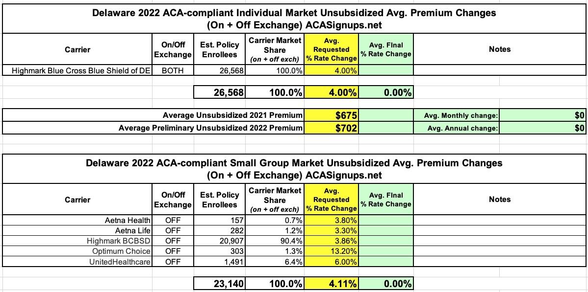 UPDATE 10/19/21: the Delaware Dept. of Insurance has issued their final rate changes for the individual market (which, again, consists of just one carrier anyway) by knocking the rate increase down from 4% to 3%. They haven't issued decisions on the small group market as of yet:
