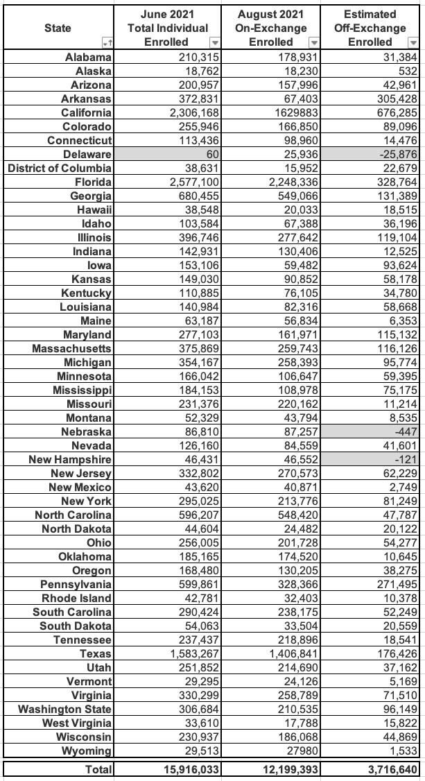 Assuming this is fairly accurate, it puts the total ACA-compliant individual market as of Summer 2021 at 15.2 million people, with 12.2 million on-exchange and around 3.0 million off-exchange nationally.