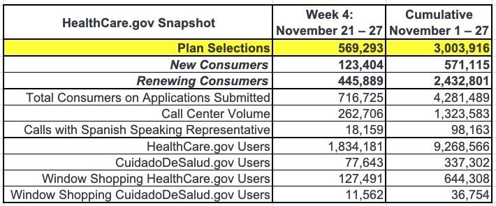 2022 OEP Week 4 HC.gov Snapshot Report: 3.0M enrollees total w/571K new