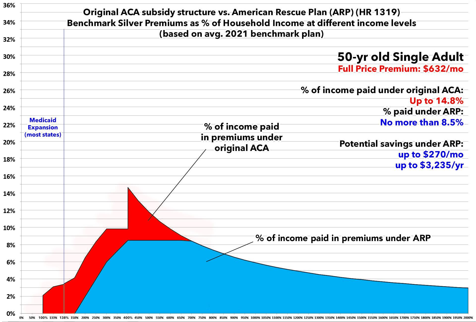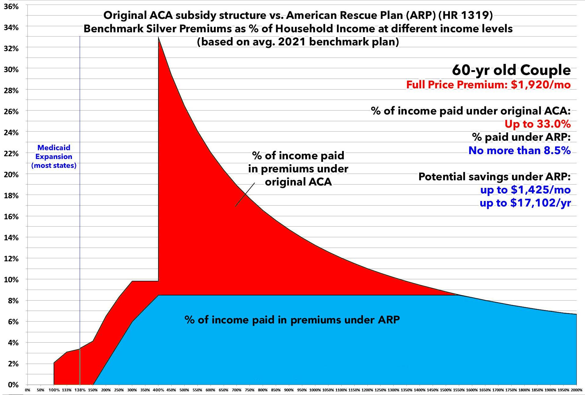 First of all, here's the final, official subsidy table under the ACA today vs. under the American Rescue Plan (ARP). This is the table which will be used at least for 2021 & 2022 (and yes, it's supposed to be retroactive to January 1st, 2021 for current ACA exchange enrollees):