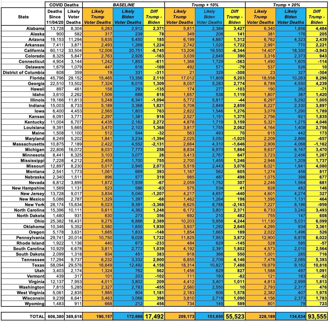 - The "Base Assumption" columns don't take anything into account other than the statewide election results and the post-11/04/20 election COVID death toll in each state. If you stopped there, there'd be nearly 6,000 more Biden voters than Trump voters who've died since the 2020 election...still an 11,000 swing from what a national popular vote count would give you.