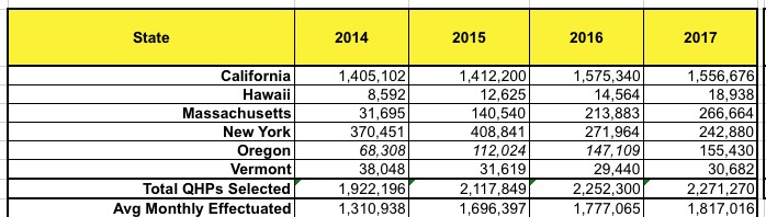 Let's start with the 6 states in which which require all (or nearly all) exchange policies cover abortion. Here's a table listing the official Open Enrollment Period QHP selections for 2014, 2015, 2016 and 2017: