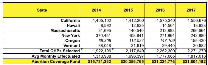 Yes, that's right: To the best of my calculations, by the end of 2017, carriers in these 4 states will have brought in roughly $79.2 million into these special "abortion funds" but will only have paid out perhaps $10.4 million of it to pay for around 30,000 abortions, leaving over $68 million just sitting in the accounts gathering dust (and interest?). Even if they cover 100% of the procedure, that's still less than $15 million.