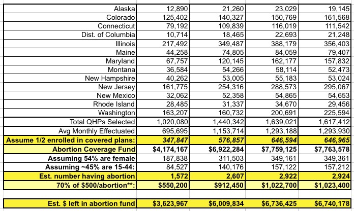 How about the other states which allow and offer policies which cover abortion? That gets even trickier since I don't know what portion of their exchange enrollees are actually in such plans. I'm going to assume perhaps 50% are enrolled in policies which include abortion coverage and 50% aren't: