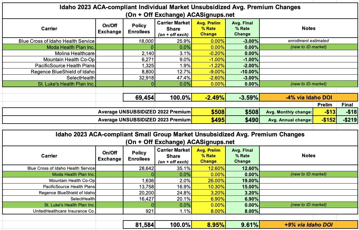 It's also worth noting that of the 21 states (including DC) that I have preliminary 2023 rate filings for, Idaho is the first one looking at average premium reductions on the individual market...in fact, every one of the 6 current carriers is dropping their average rates. There's also two new carriers joining both the individual & small group markets (Moda and St. Luke's).