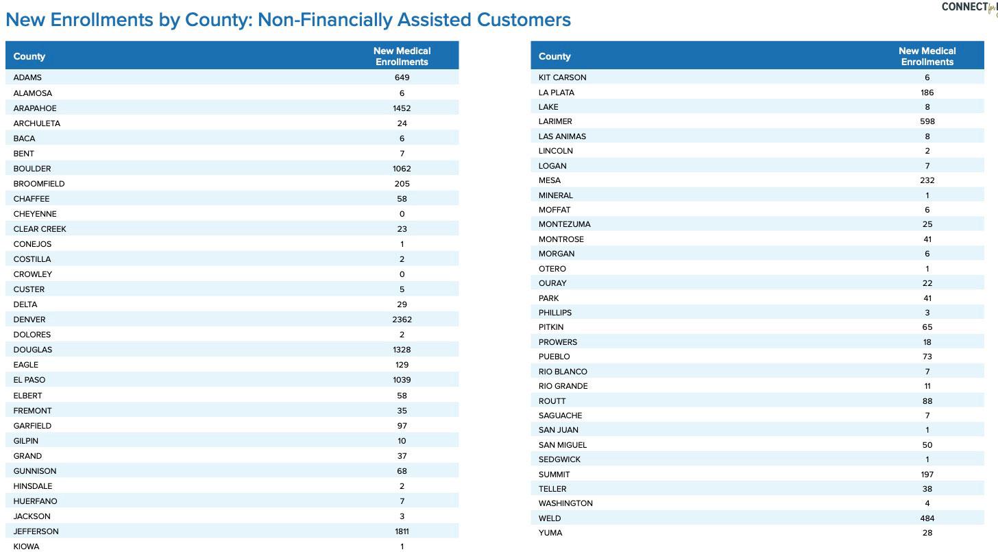 Additionally, 10,416 people enrolled in a health insurance plan through Colorado Connect, a public benefit corporation and new, online platform established by Connect for Health Colorado. The majority of those Colorado Connect enrollments were from the OmniSalud program, which provides Coloradans who are undocumented with a safe platform to compare plans, apply for financial help and enroll.