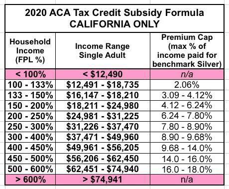 Until now, only CoveredCA enrollees earning 138-400% of the Federal Poverty Line were eligible for ACA financial assistance. Starting in 2020, however, enrollees earning 400-600% FPL may be eligible as well (around $50K - $75K/year if you're single, or $100K - $150K for a family of four). In addition, those earning 200-400% FPL will see their ACA subsidies enhanced a bit.