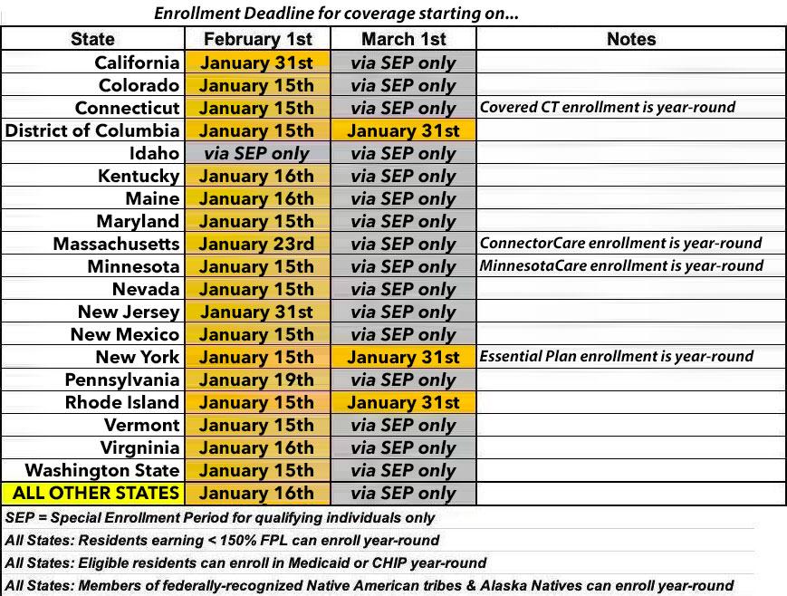 At the opposite end, most states have their final deadline on January 15th or 16th, but several states have later final deadlines. Here's a summary of the deadlines to sign up for 2024 ACA healthcare coverage, and when that coverage will start. These are subject to last-minute extensions: