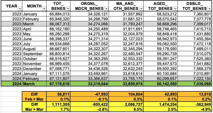 - Total Medicare beneficiaries reached 67,178,618...up just 56,811 from March