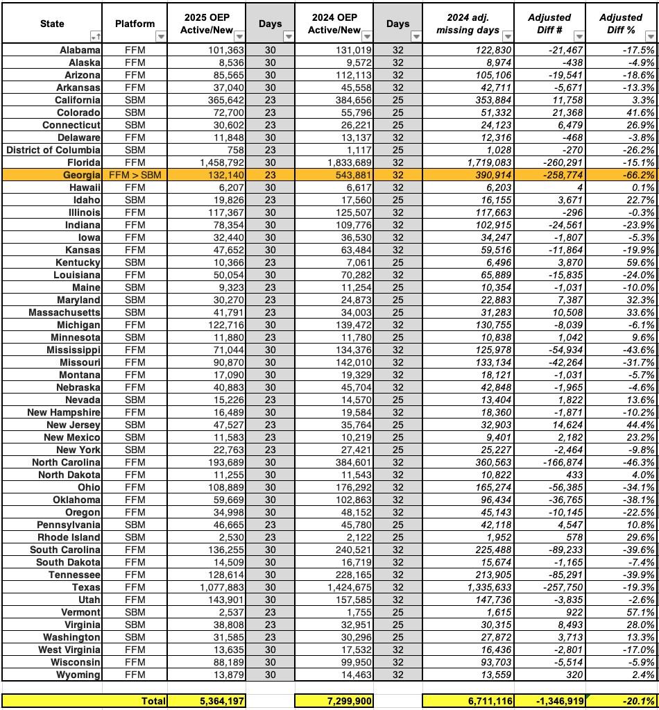 This is important for several reasons. The 2024 data above includes Georgia as an FFM state...but the 2025 data has it rightly listed as an SBM state. The problem is that unlike every other state which has to be adjusted from either 32 to 30 days or from 25 to 23 days...Georgia has to be adjusted from 32 days to 23 days!