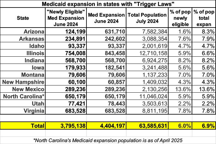 Here's the 12 states with trigger laws. Barring legislation by the individual states, between 3.8*- 4.4 million Americans would be kicked off of Medicaid from these states right out of the gate...up to 13.6% of their entire populations. It's worth noting that one of these is North Carolina, which just implemented Medicaid expansion a little over a year ago.