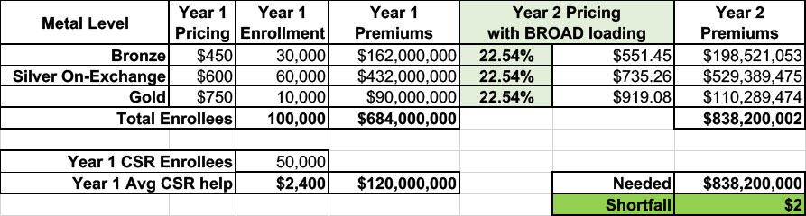 Now, if they simply divided that $10 million/month across all of their enrollees, regardless of the plan, they'd have to raise their premiums for every plan at every metal level by around 22.5% to make up that difference, as shown below. This is called Broad Loading: