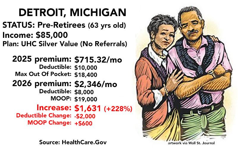 • An older couple just shy of Medicare age in Detroit earning $85K/year