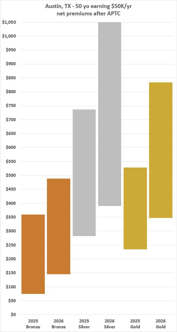 In this case the increase in net pricing from 2025 to 2026 is pretty much entirely due to the expiring tax credits: If 2026 pricing was identical but the enhanced APTC formula was still in place, the enrollee would be eligible for an additional $131/mo in APTC, which would save him an additional $1,572 for the year. This would have knocked the Gold plans down to as low as $217/month. Unfortunately, they'll have to settle for paying as little as $348/mo, which is still $43 less than the least-expensive Silver plan.