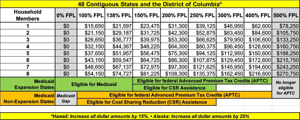 This table breaks out the key annual income levels for different FPL thresholds based on the number of members in the household. Note that all of these levels are 15% higher in Hawaii and 25% higher in Alaska: