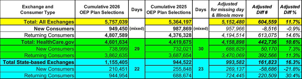 On top of that, there's also another important adjustment: Illinois, which enrolled nearly 466,000 people during the 2025 Open Enrollment Period, moved off of the federal exchange onto their own platform this year, which means you have to adjust for both the HC.gov and SBE data.