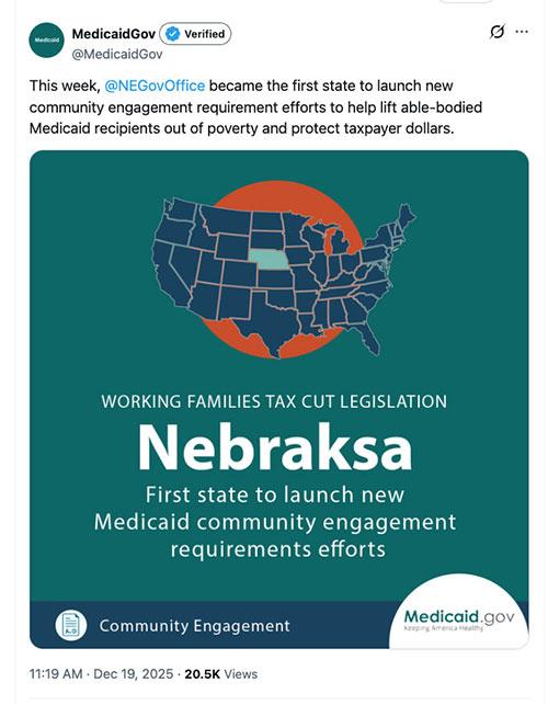 CMS touts Nebraska being first to launch Big Ugly Bill Medicaid work reporting requirements by misspelling the name of the state.