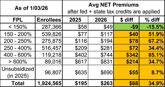 It's also worth noting that those state subsidies for the < 150% crowd came at a price: Most of the funds for it actually came from an existing program which wiped out subsidies for most enrollees the past few years, which means that in 2026...