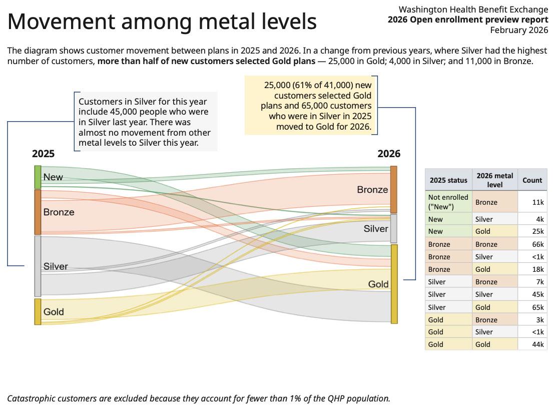 For the first time ever, most new customers chose Gold plans. Washington State Office of the Insurance Commissioner enacted an emergency rule in March 2025 to protect health insurance affordability. The rule required Washington Healthplanfinder carriers to increase Silver costs to increase available tax credits. This made it so that Silver plans were no longer the best option for many customers with incomes outside of 100–200% FPL.