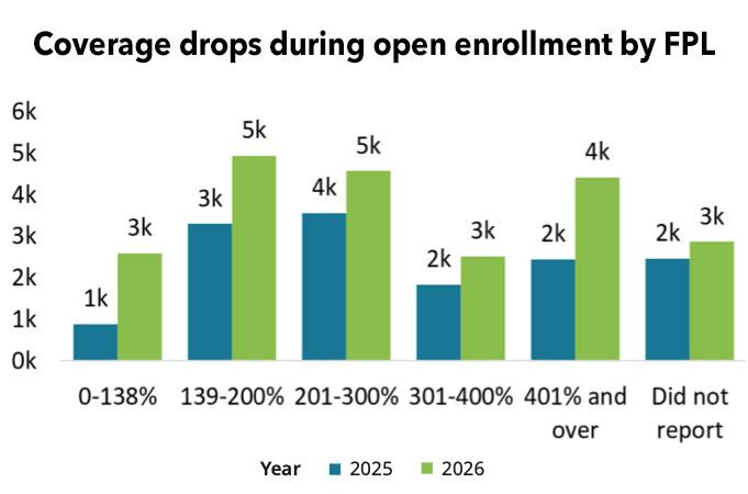 Because of the loss of federal enhanced premium tax credits, a higher number of customers to drop coverage during open enrollment this year than previous years. Drops were elevated across all federal poverty levels in 2026. Notably, the highest drops were in the 0–138% FPL category, where drops almost tripled. Another notable FPL category change was for people who made more than 400% FPL, who lost premium tax credits in 2026 and saw drops almost double over 2025.