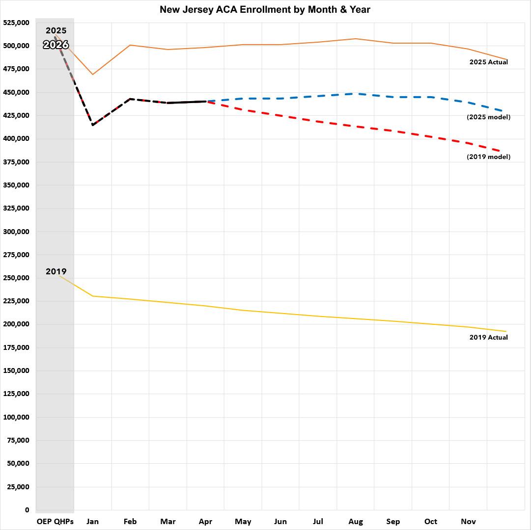 Once again: While plan selections only dropped slightly during Open Enrollment in New Jersey this year (by around 0.8%), effectuated enrollment is already nearly 12% lower. Here's what the rest of the year would look like assuming average effectuated enrollment follows the same pattern as it did last year (2025) vs. the last pre-COVID year (2019):