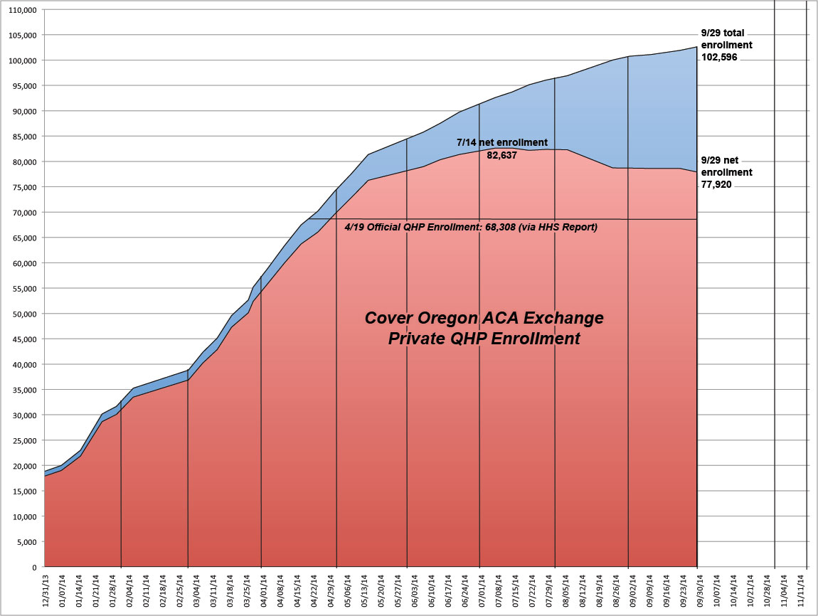 For awhile there I was concerned that Oregon's uglier-by-the-minute legal/technical headaches had caused them to stop bothering with regular updates; fortunately, they seem to be back on track again, updating both QHP and Medicaid numbers: