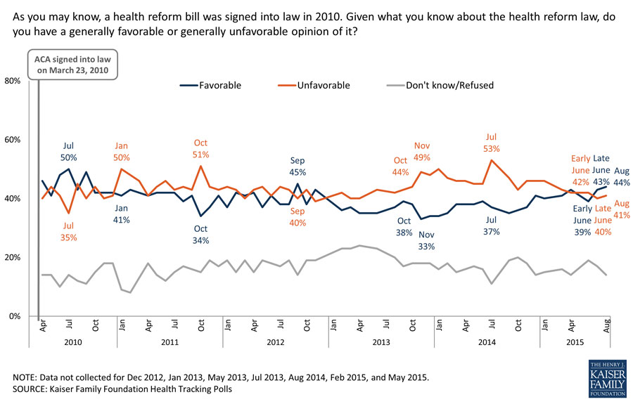 Consistent with findings over the past few months, the American public remains divided in their opinion of the health care law; 44 percent say they have a favorable view and 41 percent say they have an unfavorable view. Opinion of the law continues to diverge along party lines, with most Democrats reporting a favorable view of the law (76 percent) and most Republicans reporting an unfavorable view of the law (71 percent). Among independents, 46 percent say they have an unfavorable view, while 39 percent report a favorable view.