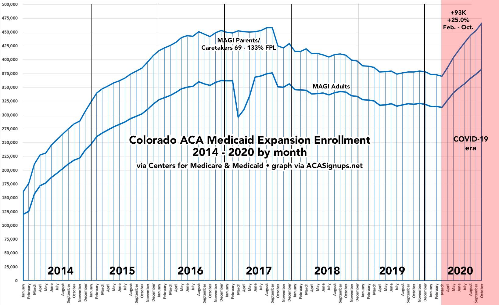 Over at Xpostfactoid, my colleague Andrew Sprung has been doing a great job of tracking ACA Medicaid expansion enrollment growth since the onset of the COVID-19 pandemic this past February/March at the macro (national) level, by looking at around a dozen states which have monthly reports available. He puts the overall enrollment growth rate at 23.6% from February thorugh October 2020.