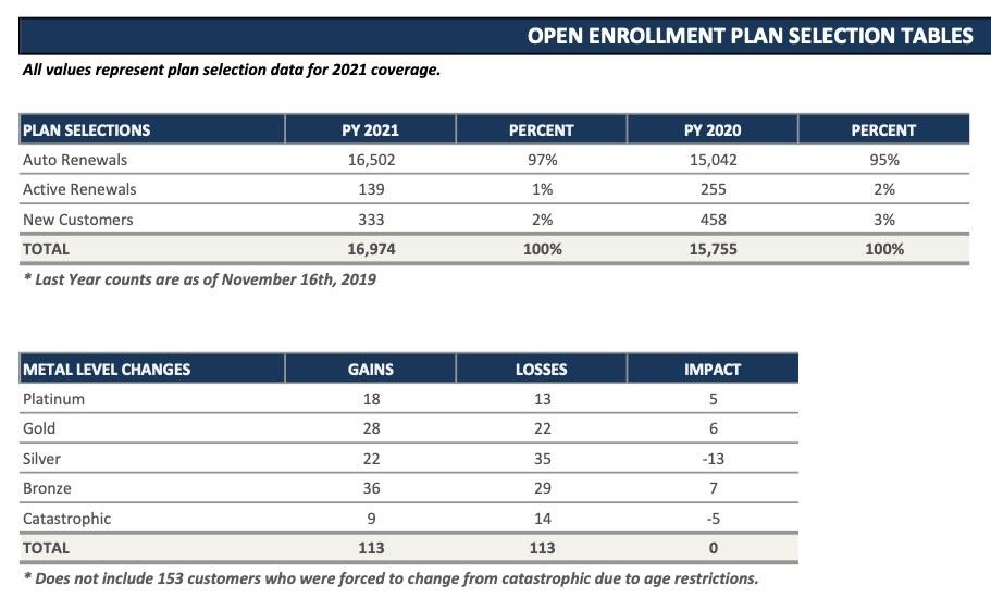 I'm pretty sure the reason for the discrepancy is that, like some other state-based exchanges, AccessHealthCT front-loads auto-renewals of all of their current enrollees, then allows them to actively go in and manually cancel their renewals. So, if they have 100K enrolled this year, they'd plug all of them in for 2021, then wait and see how many choose not to stay enrolled for 2021.
