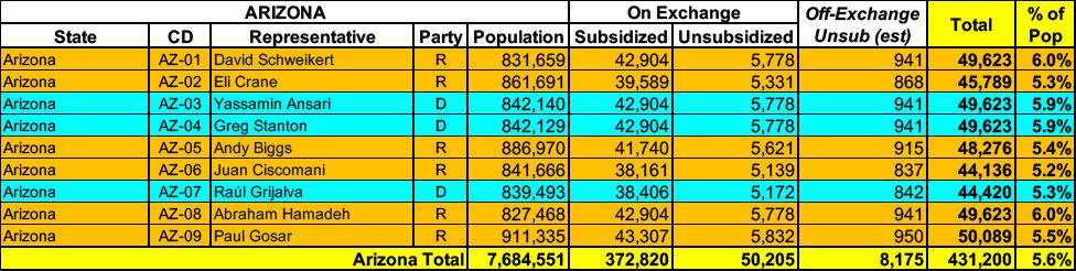 Arizona has around 423,000 residents enrolled in ACA exchange plans, 88% of whom are currently subsidized. I estimate they also have perhaps another ~8,000 unsubsidized off-exchange enrollees.