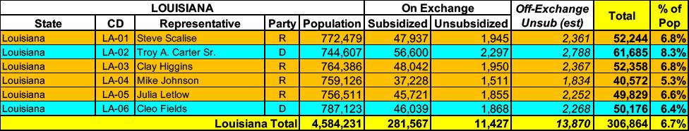 Louisiana has around ~293,000 residents enrolled in ACA exchange plans, 96% of whom are currently subsidized. I estimate they also have another ~13,000 unsubsidized off-exchange enrollees.