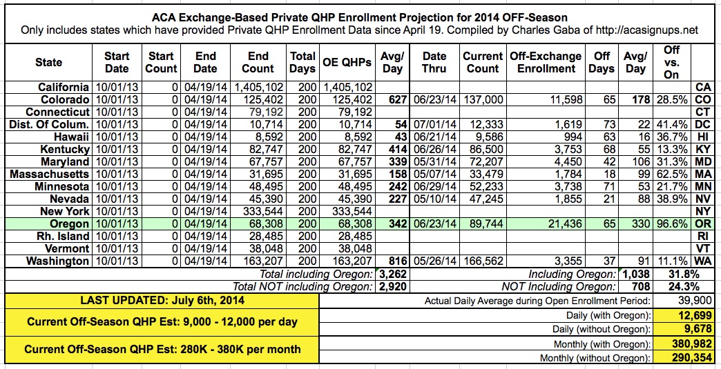 Well, today they issued another update: As of July 1st, the total is up to 12,333. This is another 751 higher, bringing the overall off-season average up to 22 per day. That's right: Just like in Colorado, DC's QHP off-season enrollment rate is actually increasing as we move farther away from 4/19...at least so far.