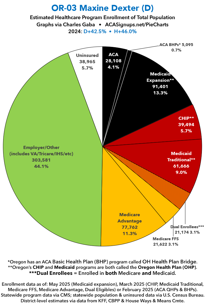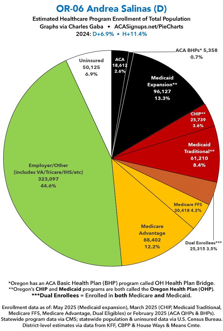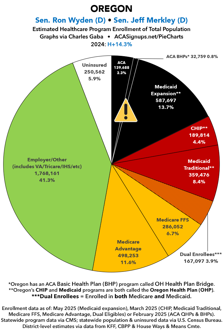 UPDATE 7/10/25: I've updated the web versions of the graphics with the most up-to-date enrollment data I have access to. The black sections w/the ⚠️ symbol are those most at risk of losing healthcare coverage due to H.R. 1, the "One Big Beautiful Bill Act" (aka the #MAGAMurderBill).